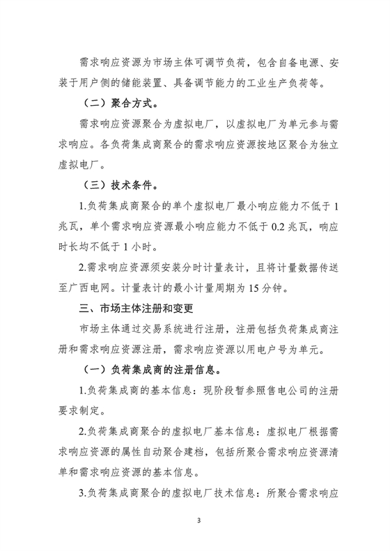 其中负荷集成商聚合的单个虚拟电厂最小响应能力不低于1兆瓦,单个需求响应资源最小响应能力不低于0.2兆瓦,响应时长均不低于1小时。需求响应资源须安装分时计量表计,且将计量数据传送至广西电网。计量表计的最小计量周期为15分钟。