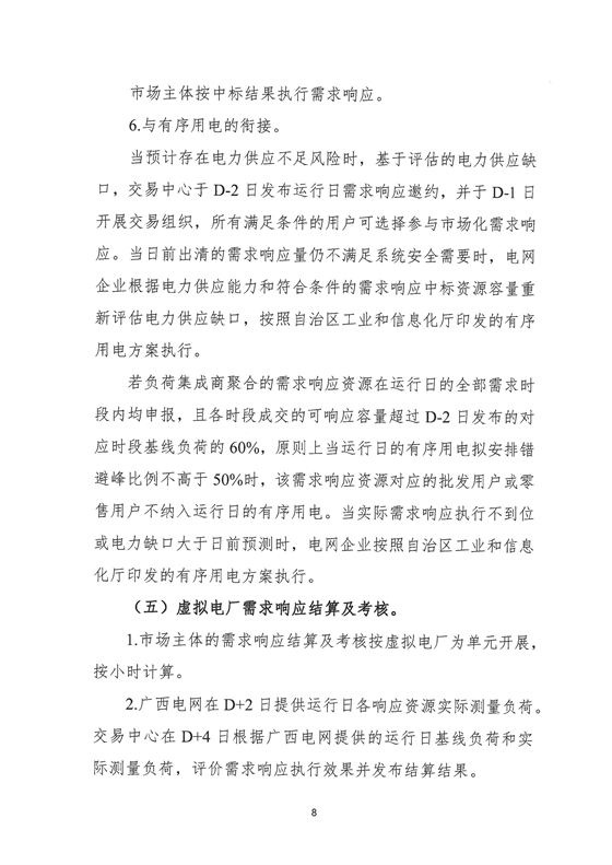 北极星储能网获悉,11月26日,广西工信厅发布《广西电力市场化需求响应实施方案(征求意见稿)》,文件提出,需求响应资源为市场主体可调节负荷,包含自备电源、安装于用户侧的储能装置、具备调节能力的工业生产负荷等。需求响应资源聚合为,以虚拟电厂为单元参与需求响应,参与需求响应报价上限不超过2.5元/kWh。