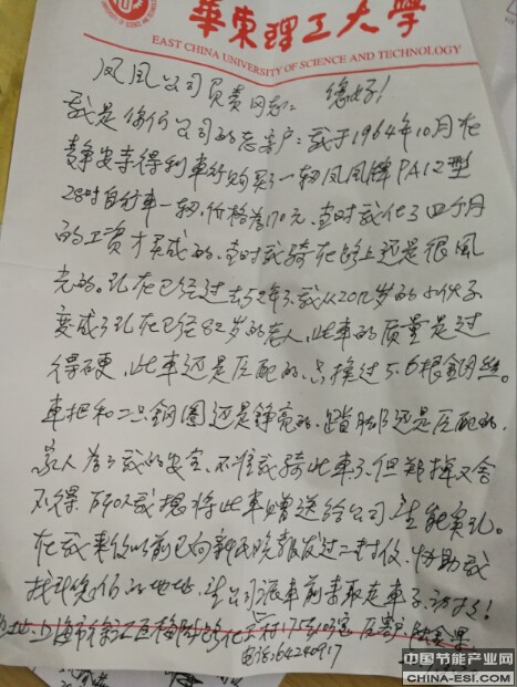 八旬老用户给上海凤凰自行车的来信