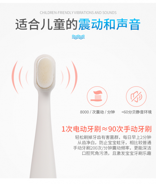 众所周知,电动牙刷的工作原理是通过震动清洁口腔,刷掉牙齿有害菌群,带走口腔内的食物残渣。倍加洁可可奈儿童电动牙刷震动频率达到8000次/分钟,小于60分贝静音环境。既能实现有效的口腔深度清洁,又完美避免了宝宝因为电动牙刷的震动声音而产生的不适感。