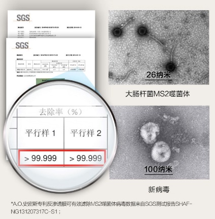 *A.O.史密斯专利反渗透膜可有效滤除MS2噬菌体病毒数据来自SGS测试报告SHAFNG131207317C-S1