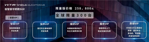 看到这里,在座各位是否跟我一样心痒难耐?但好消息还没有说完。VV7 GT brabus | automotive这次上市,还推出了智联VIP、保养VIP、维修VIP、服务VIP、质保VIP共五大特享极智VIP权益,包括智能网联服务终身免费、首任车主基础保养终身免费、车辆维修期间给予车主交通费用补偿、维保项目上门取送车服务免费,以及5年15万公里超长质保,首任车主发动机、变速器终身免费保修服务。