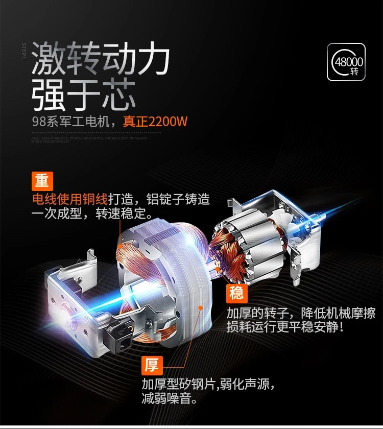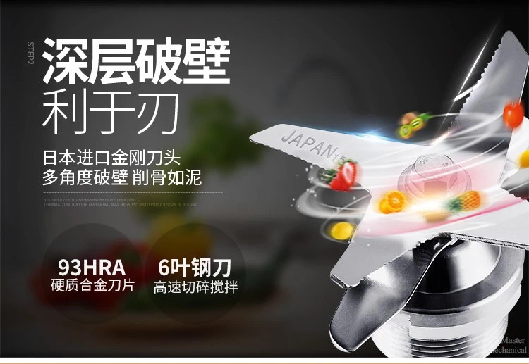 其转轴采用日本NSK滚子轴承具备超强使用寿命。配合日本原装进口六叶钢刀片,多角度破壁,削骨如泥,不但可以将五谷杂粮,水果,甚至可以把整条鱼,大骨,瞬间击碎,打成浓汤,无需过滤,直接饮用。