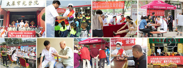太原肤康皮肤病医院始终追求社会责任和自身发展的和谐统一,积极参与公益事业、扶弱济困,始终坚持把温暖和关爱不断传递到社会,为方便社区居民、月服务社区百姓,我院定期举行社区义诊、预约服务,为人类的皮肤健康事业做贡献,树立全国民族医疗品牌标杆!