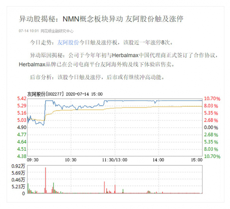 7月14日,NMN概念股全线爆发,友阿股份、金达威、雅本化学等集体涨停。据“同花顺”报道,友阿股份爆发的原因在于其已与NMN技术的引领者瑞维拓达成合作,并在友阿海外购平台上线瑞维拓系列产品,由此引发了该股1年涨停8次的动能。