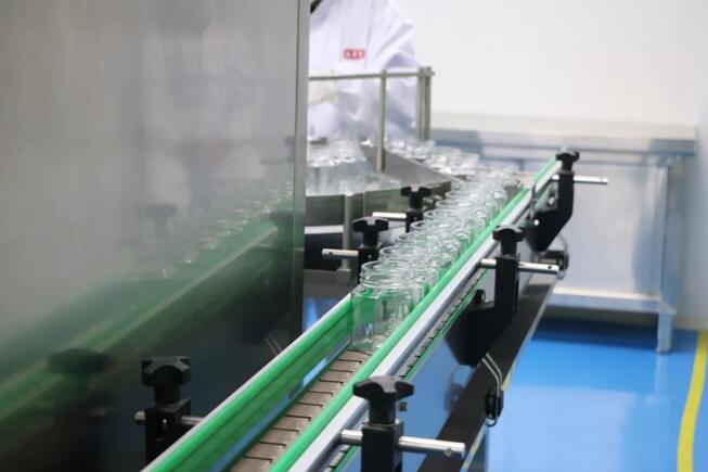 膏体经过管道进入罐装区,瓶体通过传送带从洗瓶车间进入罐装区,全程都是机械化无人工操作,避免细菌的产生。