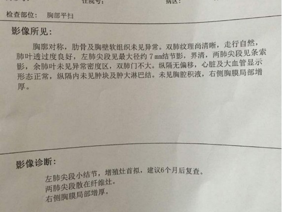 余女士36岁,因为感冒时间长一直不好去医院做胸部ct检查时,检查结果显示余女士肺部有个直径近7mm的磨玻璃结节,现在还不能确定是否是良性的,确定的话得做活检,然后三个月复查一次,如果有变大的可能就得进行手术。余女士一回家上网开始搜肺结节的资料,不查还好,查完立马被恐惧感包围,感觉随之而来就是肺癌。后来拿着报告单托人问了几个医生都说没有更好的办法,就是观察,西医上没有什么针对结节的治疗方式或是药,不能确定是否良性,除非活检,再变大也就只能手术。