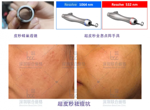 皮秒激光不仅祛斑效果出众,还具有超强的嫩肤功效。当皮秒能量进入皮肤,震荡波能传递至深层真皮层,造成胶原蛋白受到震荡波刺激,重启修复,让胶原蛋白新生。因此除了祛色素之外,皮秒还能改善细纹、毛孔粗大、痘坑、皱纹等问题,让皮肤都变得紧致平滑。皮秒的蜂巢透镜(聚焦点阵),超皮秒的Resolve (全息点阵)就是做嫩肤的手具。