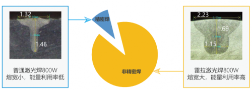 采用雷拉激光的专利技术——光束整形技术,在同样的激光功率下,可以获得更优质的焊缝,具有更大的熔宽、更多的有效熔深,从而降低了对于工件装配公差的要求,雷拉激光激光焊接设备拥有更高的性价比。