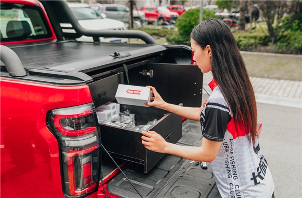 论助力钓鱼,参与路亚锦标赛的长城炮超大的后货箱和经过改装的组件,能够存放各种钓鱼设备以及钓到的鱼获。为避免鱼线缠绕、鱼获倾洒,长城炮越野皮卡货箱改装为滑轮抽屉式隔断储物仓,钓鱼用具能够存放的井井有条、鱼获与用具干湿分离,隔离鱼腥味,这些都是SUV车型所不具备的独特优势。