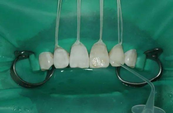 适用于有实质缺损,但缺损较小的氟斑牙患者。选取与患者颜色相匹配的树脂材料,用雕塑刀进行成形,光照固化,最后修整外形抛光。
