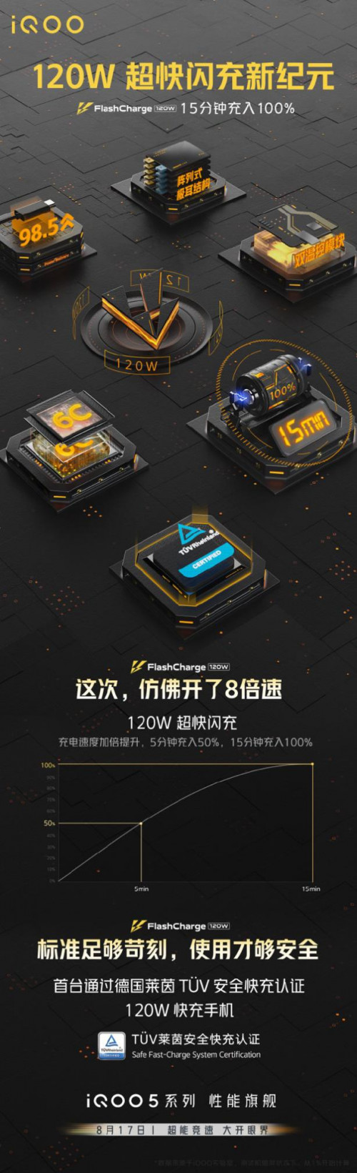 2020年8月5日,@iQOO手机 官方微博放出一张120分闪充海报,表达iQOO 5 系列将搭载120W 超快闪充技术,为用户带来15分钟充至100%的极速充电体验。这是业内首次将120W 超快闪充技术应用在手机上,不仅解决了用户对于效率工具的需求,也对5G高刷耗电的问题提供了一个高效解决方式,更是带领手机行业跨入百瓦闪充时代。