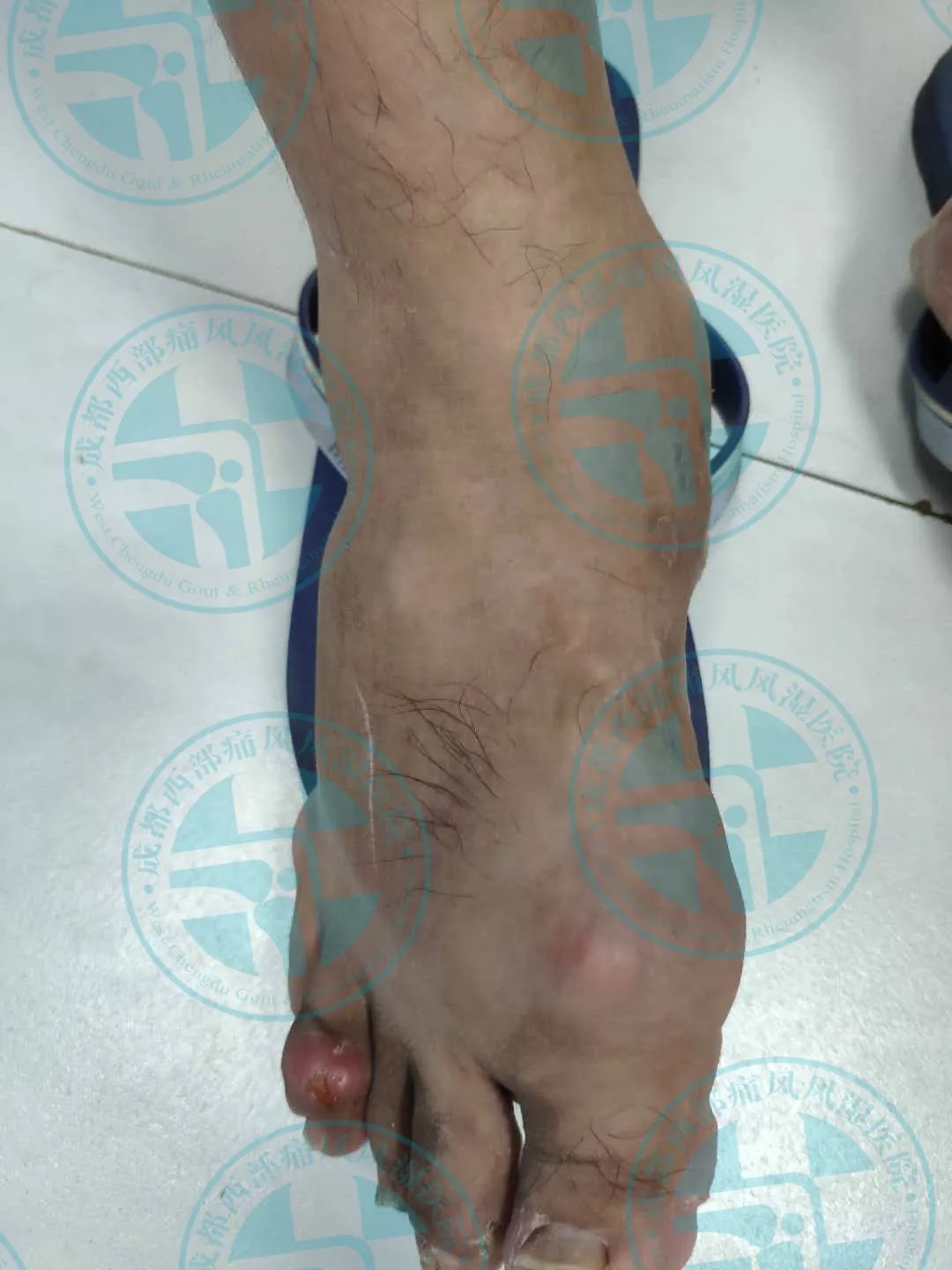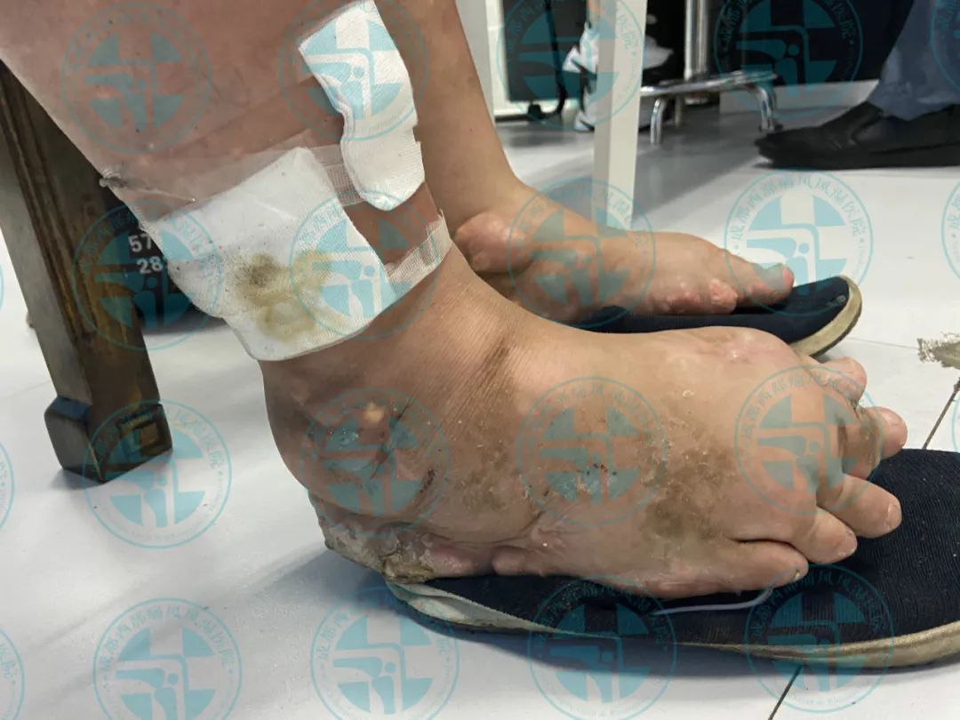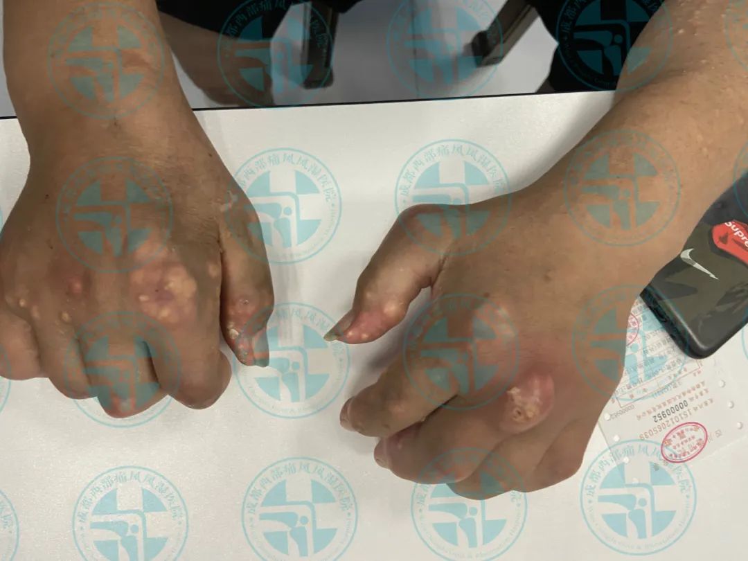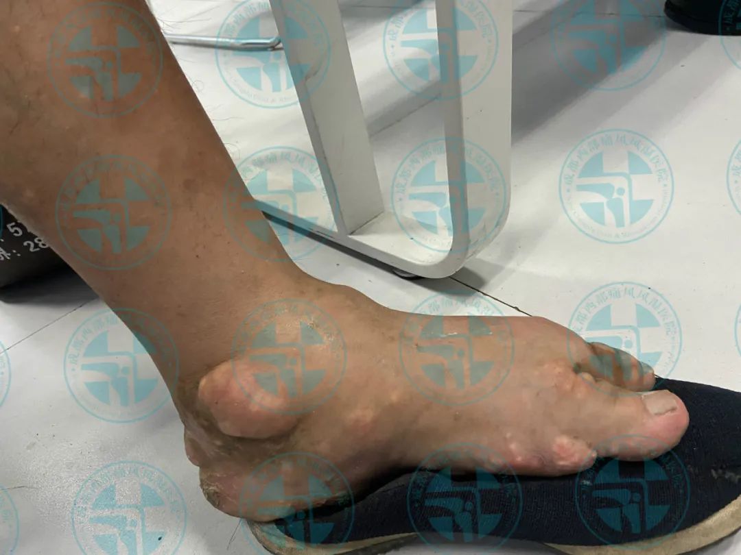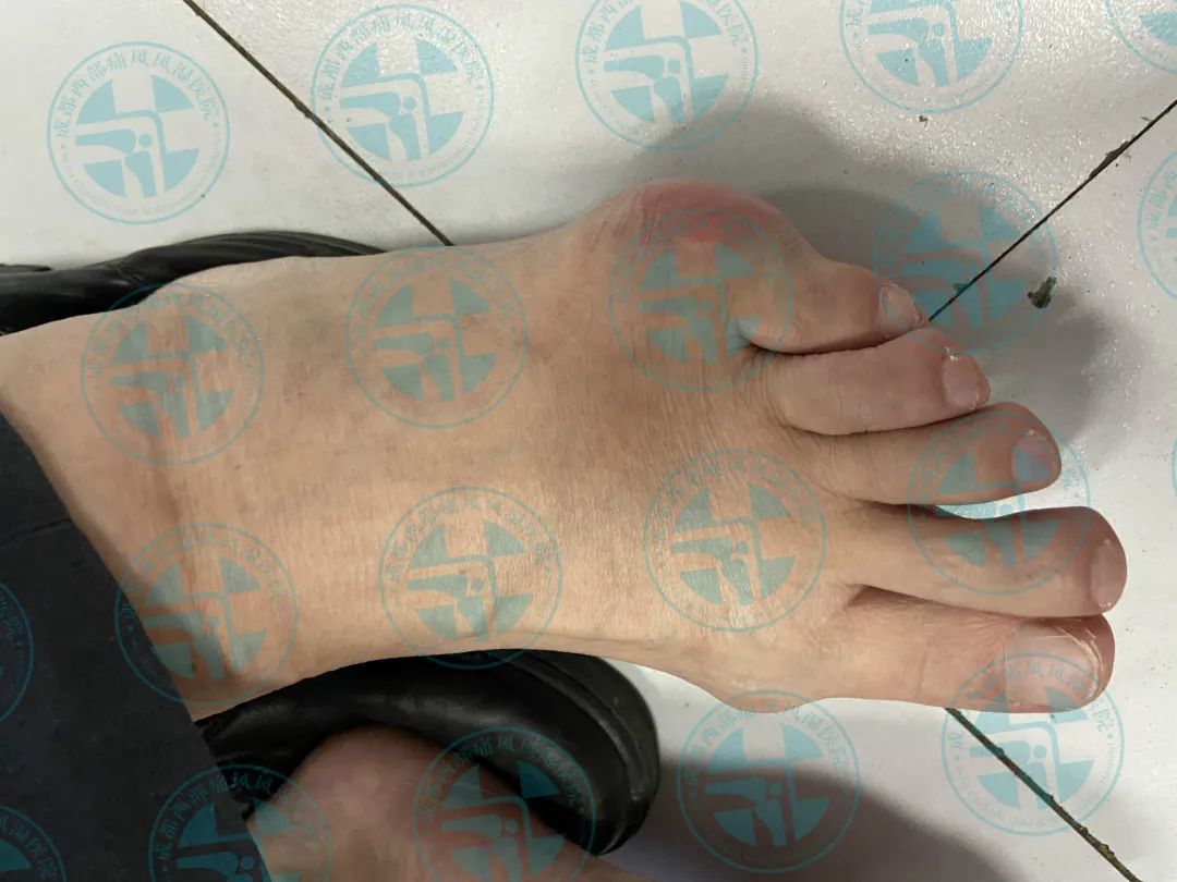 患者王先生10年前无明显诱因出现右足第一跖趾关节红肿、疼痛,在当地医院就诊经检查尿酸高(具体数值不详),确诊为“痛风性关节炎”,经口服消炎止痛药物后疼痛缓解(具体药名不详),10年来病情反复发作并逐渐累及双足、双踝、双膝、双肘、双手、双腕、双耳等关节并出现痛风石,期间每次疼痛发作时均以口服消炎止痛药物缓解症状(具体用药不详),2月前出现右下肢痛风石破溃并伴有粉笔灰状液体流出。