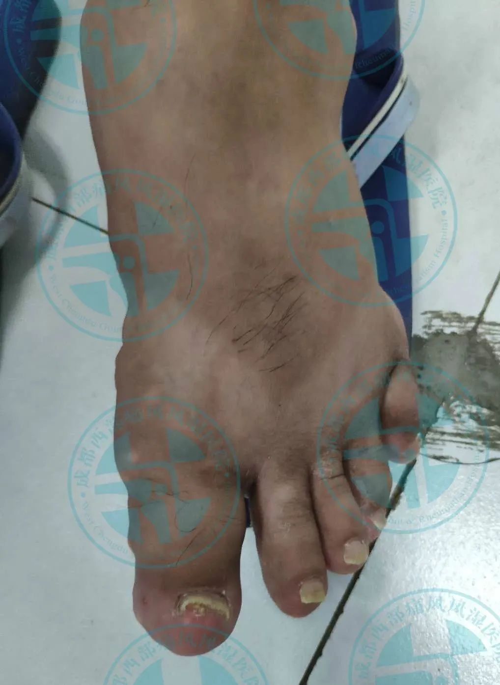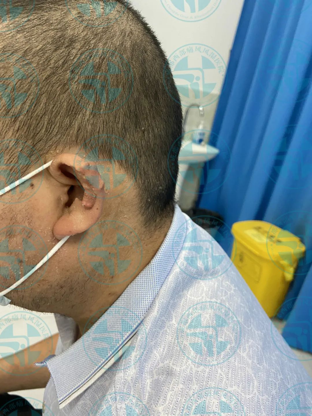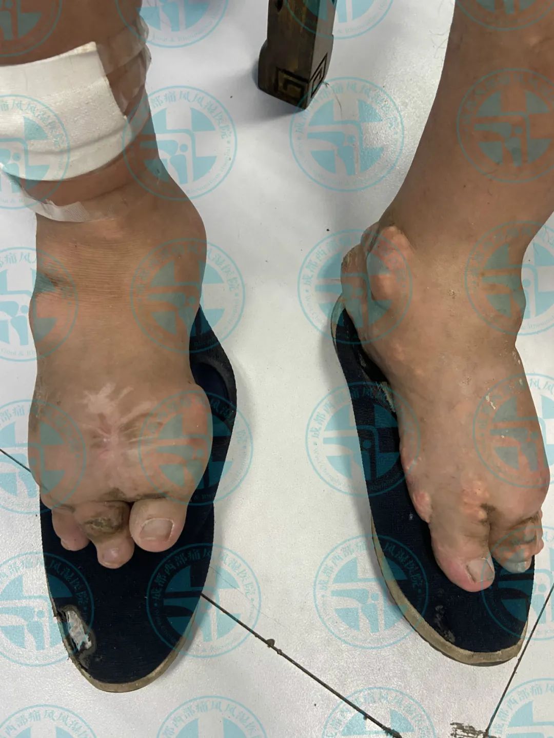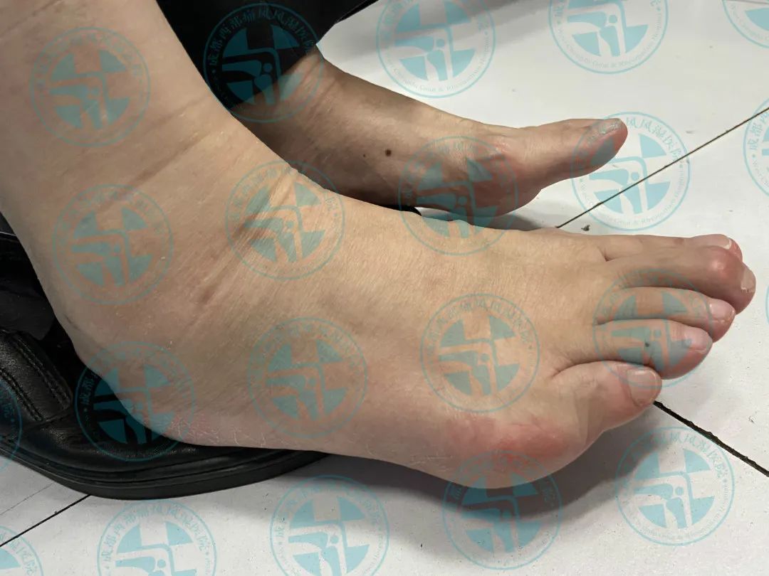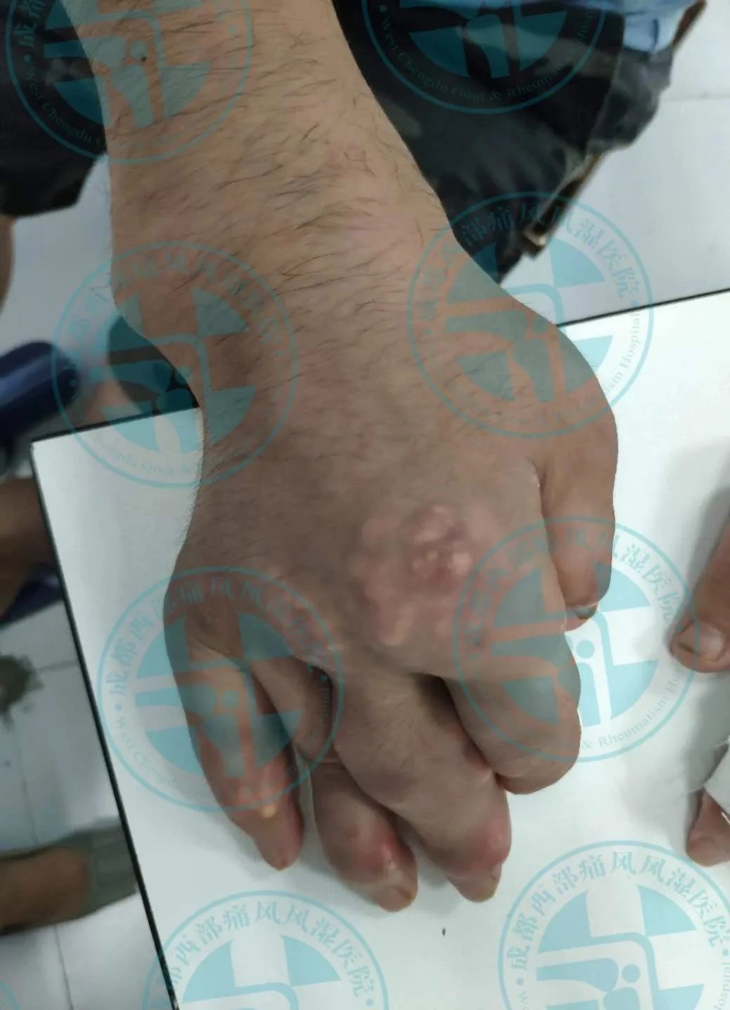 患者王先生10年前无明显诱因出现右足第一跖趾关节红肿、疼痛,在当地医院就诊经检查尿酸高(具体数值不详),确诊为“痛风性关节炎”,经口服消炎止痛药物后疼痛缓解(具体药名不详),10年来病情反复发作并逐渐累及双足、双踝、双膝、双肘、双手、双腕、双耳等关节并出现痛风石,期间每次疼痛发作时均以口服消炎止痛药物缓解症状(具体用药不详),2月前出现右下肢痛风石破溃并伴有粉笔灰状液体流出。