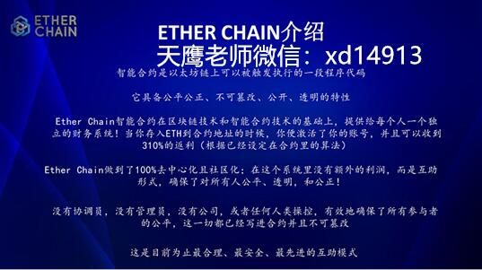 Ether-Chain是一款基于以太坊技术链上开发的智能合约,其商业逻辑协议,财务数据信息部署在以太坊区块高度上;无服务器,无域名,无App,无后台,无操盘手,所有程序架构在以太坊智能合约上,可通过任意去中心化钱包进行操作。