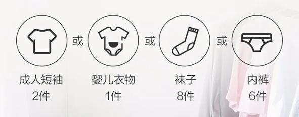 一次大约可洗涤0.8KG的衣物≈成人短袖2件,或婴儿衣物1件,或袜子8件,或内裤6件。