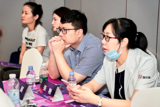 在培训现场,郑罡专家当众十分详细地讲解了当下医美注射技术,包括操作要点与注意事项,并为志愿者进行面部设计,亲自演示注射的规范操作流程和细节。在场者无不倾听,与专家互动。