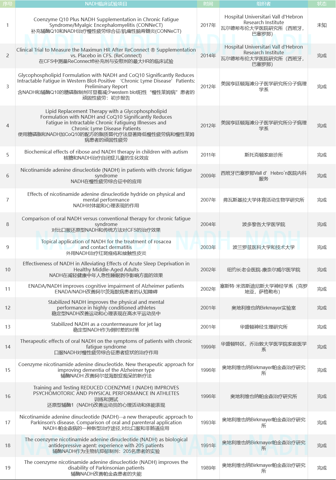还有19项的NADH人体临床试验,完成并发表论文的有18项,分别由来自美国纽约、华盛顿,西班牙巴塞罗那,奥地利维也纳,克罗地亚,波兰等地的大学医学院、医院的研究团队主持。这些临床试验评估了NADH对运动表现,慢性疲劳,神经\认知退行性疾病,情绪病,倒时差,睡眠,皮肤炎症等的效果。研究结果积极,NADH在某些方面尤其表现优秀,如改善疲劳,提升精力,改善神经/认知功能障碍,情绪,运动表现等。这些人体试验,证明了NADH的安全性和有效性。