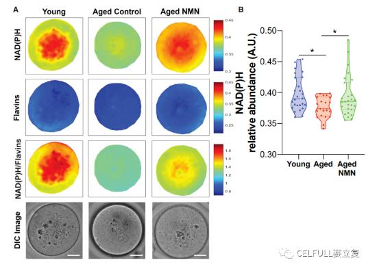 该研究发现,与年轻小鼠(4到5周龄)相比,老年小鼠(12个月龄)的卵母细胞中NADH和NADPH的水平更低,而通过给老龄小鼠补充NMN可以改善NADH和NADPH下降,使其恢复到年轻时的水平。虽然表面上是NADH和NADPH的水平随着补充NMN而恢复,不过作者提到生育力的恢复其实是NAD+水平提高的作用效果,这也说明提升的NADH和NADPH最终是转化为NAD+而达到抗衰老、恢复生育能力的目的。