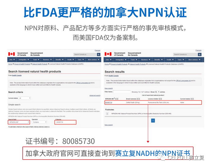 赛立复线粒体NADH的安全认证包括:2018年获得世界上对膳食补充剂管理最严苛国家之一加拿大的天然营养品NPN证书(证书编号80085730),可在加拿大卫生部官网查询;2019年,通过美国食品药品监督管理局FDA备案。