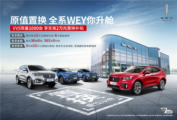 当然,最令人兴奋的还要数VV5推出的大手笔活动:“原值置换,全系WEY你升舱”,符合条件的车主参与置换,至高可获得2万元置换补贴+6次基础保养,至高实现100%原值置换。并且,参与置换,车主还可叠加至高10万元限额贷、30期0息,或者至高8万元限额贷、36期0息的金融政策,至高可省下1.2万元金融贴息,再加上VV5各地在8000元左右浮动的终端优惠和3000元公务员购车基金,置换VV5一次至高可省4万+,简直令人心动。