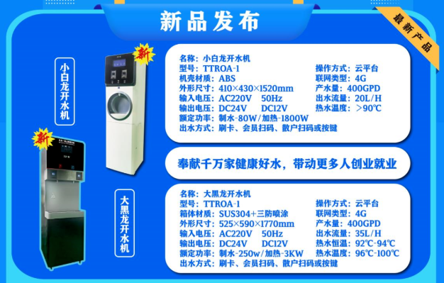 北京天天传奇集团作为中国净水设备行业的优秀企业,每年都有功能前卫强大、性能独特智能安全、性价比非常优越的新产品上市。本次新上市的四款产品:水霸王售水屋,大黑龙、小白龙智能电开水机和便捷宝智能升级系统。
