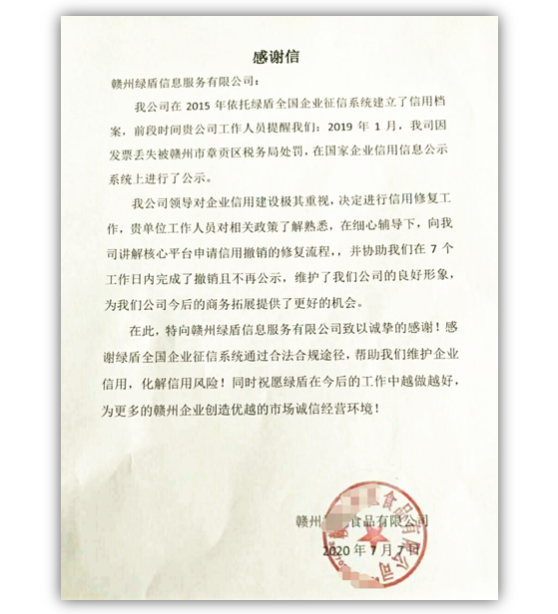 近期,赣州某食品公司致信绿盾征信赣州服务机构,感谢绿盾工作人员在该公司开展信用修复工作中提供帮助。