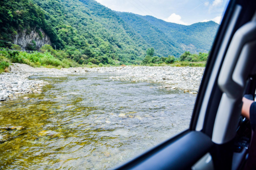 这段河床长度约2公里,主要由涉水路和鹅卵石路组成。拥有双速TOD智能四驱和三把锁的哈弗H9拥有强大的路况适应能力,面对这样的路况,应对地游刃有余。再配合最大功率达165KW ,最大扭矩385Nm的2.0T发动机,基本可以用“横行霸道”来形容教学现场的挑战气势。