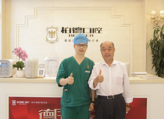 在张国祥老先生的手术直播过程中,张老先生还和我们提及,自己是在一次朋友的介绍中才走入柏德的。因为早年口腔医疗没有现在这么先进发达,自己的牙齿就被错拔过,就是因为有了这样的一个经历,让张老先生从30多岁就开始缺牙了,紧接着的就是口腔护理意识的薄弱,让其它的牙齿也跟着遭了殃,所以才在朋友的介绍下来柏德做了补牙,第一次接触到柏德的德系标准流程的专业服务,张老先生不禁竖起大拇指,称赞医生专业,技术好,就从这样的一次补牙体验之后,张老先生就把自己的口腔交给了柏德来维护,所以这次种牙,选择了柏德口腔!