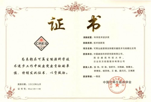 在大会同期举办的2020年度中国可再生能源学会科学技术奖颁奖典礼中,由日出东方控股股份有限公司与中国建筑科学研究院有限公司、西安建筑科技大学共同完成的“可再生能源清洁供暖关键技术与规模化应用”项目获得科学技术进步一等奖。