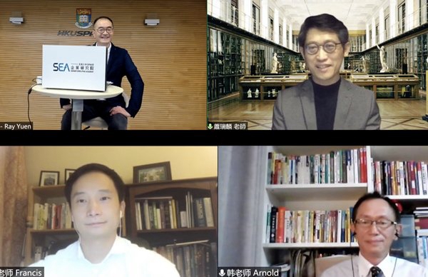 香港大学前副校长程介明教授,港大SEA名誉教授、台湾政治大学科技管理与智慧财产研究所萧瑞麟教授,港大SEA企业扩张与风险管理课程客席讲师、中伦律师事务所高级国际顾问Robert Lewis先生,微软亚洲研究院副院长潘天佑博士,港大ICB客席讲师、台湾“领导人教练”先驱之一陈茂雄先生,港大ICB客席讲师、台湾奥美第一代广告人韩立光先生,通用汽车(中国)别克市场总监刘展术先生,著名财经作家、沃德国际管理顾问有限公司董事局主席卢麒元先生等嘉宾,从香港、北京、台湾、美国等全球各地隔空连线,分享真知灼见,共商未来解局之道。