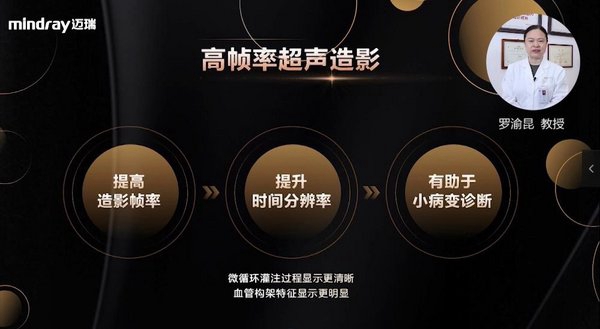 在发布会“昆仑”综合应用解决方案的介绍中,迈瑞产品经理付光明先生邀请罗渝昆教授为大家做了临床分享。正如专家所言,宽波束的域扫描技术,单次扫描的波束覆盖面更大,因此可减少发射端的次数,极大地提升超声扫描的速度和效率。在保证图像质量的同时,提升造影帧率。