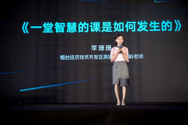 烟台经济技术开发区高级中学的教师李珊珊现场展示了OK智慧学习引擎驱动下的智慧课堂教学和学习模式。
