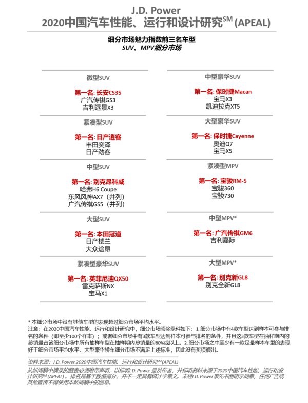 J.D. Power 2020中国汽车性能、运行和设计研究(APEAL)SUV、MPV市场魅力指数前三名车型