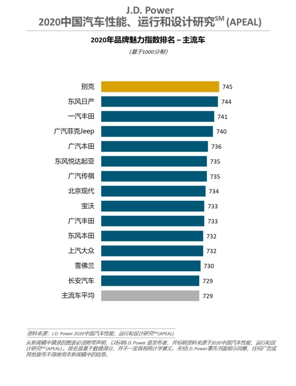 J.D. Power 2020中国汽车性能、运行和设计研究(APEAL)主流车品牌魅力指数排名