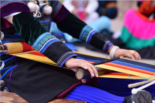 彝族绣娘用腰机织布机来织造土布