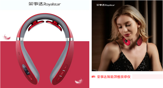 荣事达智能颈椎按摩仪,轻薄设计,可通过远红外光照射、光学恒温热敷、定点低频脉冲按摩,舒缓消费者颈椎疲劳,为消费者出行带来更轻松的体验。