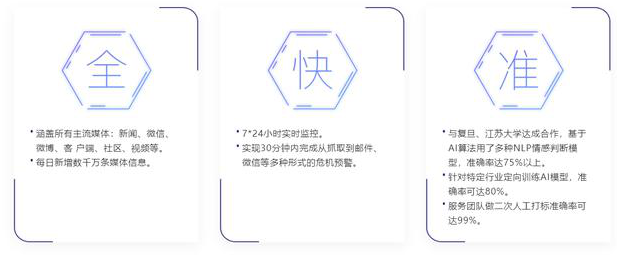 北斗创星(天津)大数据服务有限公司和北斗创星科技有限公司联合研发的舆情监测管理系统可以在发生重大舆情事件的时候,会提供全天候的检测预报和专项报告,可以给出响应的分析建议,目前这个舆情监测中心为20余个省、区、市监管部门及企业提供舆情监测与分析服务 其中还用到了聚类算法,将这些数据组合成为了一个单一的连续数据模型,从而让多个警报合并成为一个时间,从而实现非常整齐的排序。