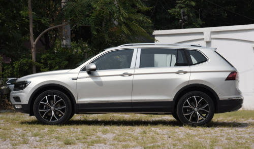 我们再来看看途观L的外观设计,前脸采用横置式进气格栅,由三条镀铬饰条装饰,两侧的大灯造型方正,造型略显呆板,远远没有探岳的生动灵活,车身侧面的造型同样十分方正,就连车顶的线条也是直来直去,这样做或许对内部空间有利,但是从外形上看确实没有什么吸引力,短小的尾翼翘起,配上平直的车顶,看上去显得十分硬朗。车尾翘起的小尾翼实际的作用不大,只是在视觉上确保了平直的尾部不会给人一种断崖式下降的既视感,起造型相比探岳车尾的尾翼来说,并没有为途观L的运动性表现起到什么作用,虽然说我不喜欢途观L的外观造型,但是外观这件事儿终究是件见仁见智的事情,只是在灯光方面,途观L显得缩水严重,探岳全系标配的LED大灯、LED日行灯、LED转向辅助灯、LED尾灯等,在途观L上,只出现在中高配车型上。