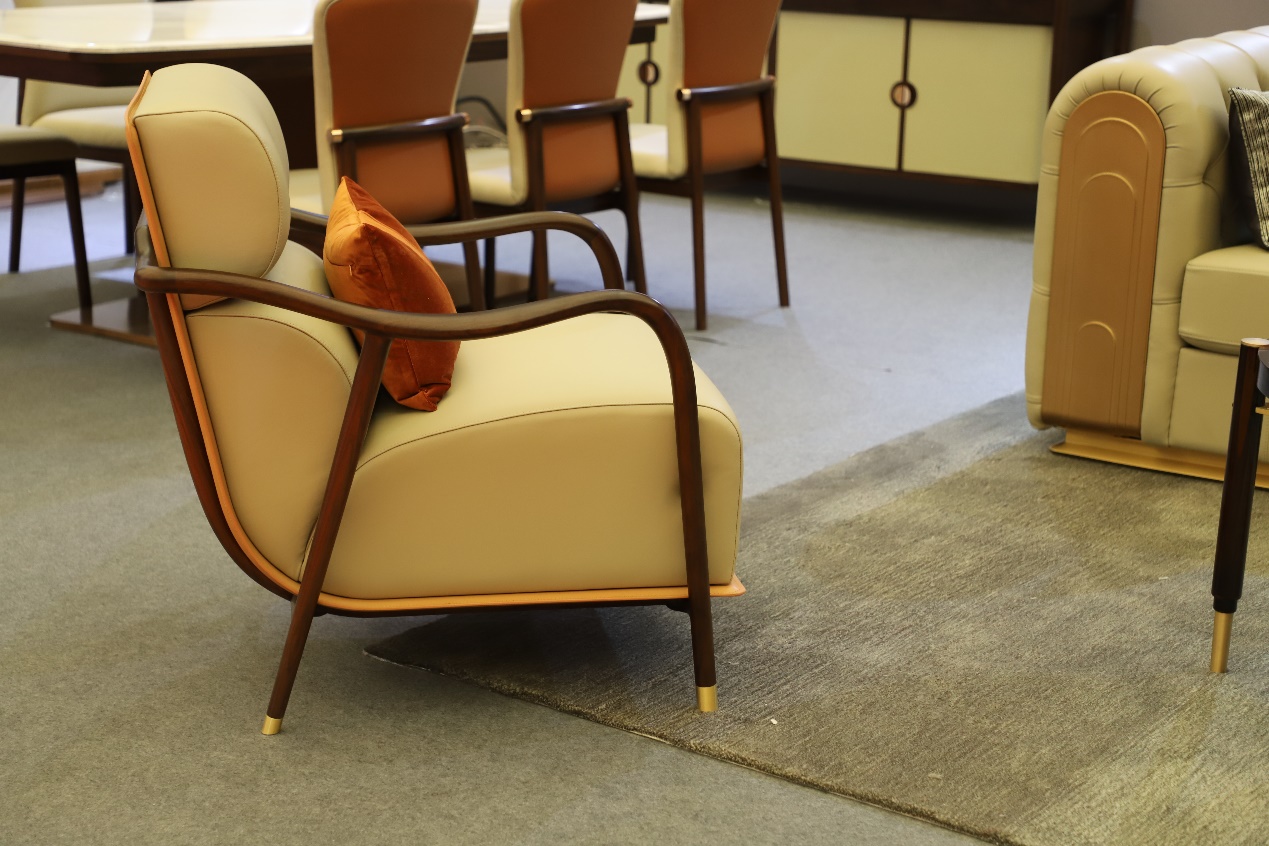 单人沙发的设计灵感源自明清圈椅,既保留了传统的典雅线条和韵味,又通过现代的材质和工艺赋予其时尚的观感与舒适的体验。