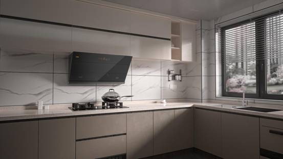 首先,JQC1采用直吸直排的产品结构。科学设计风机倾斜度,使灶面、进风口、蜗壳口、出风口形成四点一线,油烟不转弯,直吸直排更顺畅。同时,进风口位于580mm安黄金控烟区处,在油烟的“乍起-升腾”阶段迅速排烟,不给其机会扩散,体现在应用体验上,就是吸排速度快,没有油烟滞留。