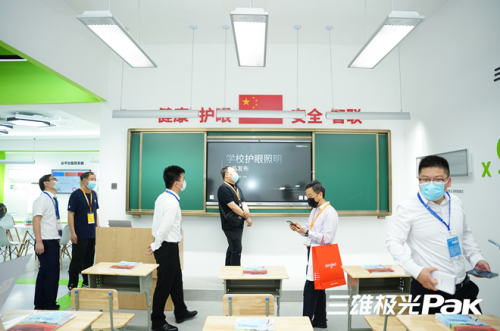 近年来,照明设备在教装展中越来越受到重视,皆因着力于提升护眼方面,对近视防控起到积极作用。在三雄极光智慧教室体验区里,室内灯具能根据环境光的明暗自动调节其自身亮度,使得课桌面照度恒定在国家标准要求的300lx以上。这样不仅可以更好地调节自然光与人工光的平衡,也能有效调节近窗侧和远窗侧的灯具亮度,达到按需照明,节能降耗的同时也能提升视觉舒适度。