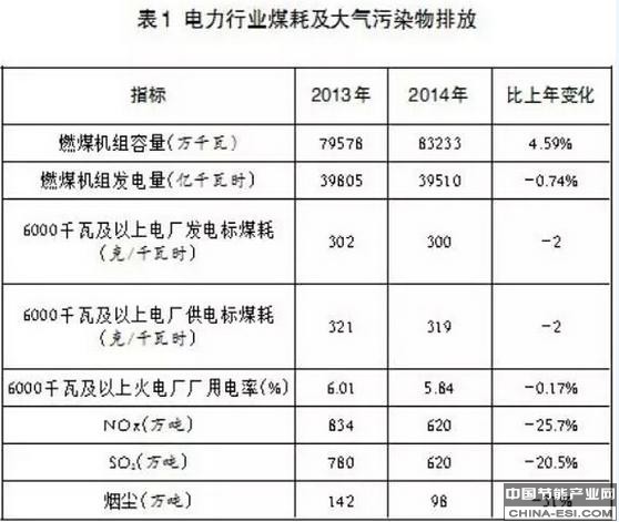 据不完全统计,2014年全国实现超低排放的至少有14个电厂的19台机组,总容量834.5万千瓦,其中有3台百万千瓦燃煤机组。表1显示全国电力行业污染物排放及煤耗指标。