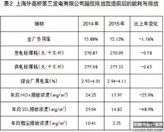 表2给出的是上海外高桥第三发电有限公司超低排放改造前、改造后的能耗与排放情况。由表2可见,2015年实现超低排放后,大气污染物下降幅度很大,在全厂负荷率略有下降的情况下,发电煤耗与供电煤耗不但没有上升,反而有所下降。