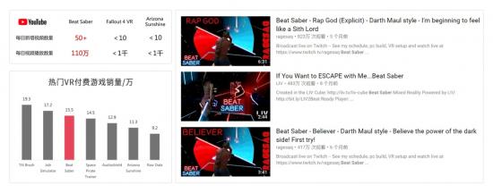 《Beat Saber》首周杀入VR付费游戏历史累计销量TOP3,成为2018年上半年当之无愧的最热VR游戏。玩家始终投以超高的热情和关注,平均累计游戏时长4.5小时,超过6000篇评测中97%给出了好评,口碑炸裂。搜索热度远超《Arizona Sunshine》、《Fallout 4 VR》等热门VR游戏,在YouTube上每日新增视频数量超过50个,每日视频播放量超过110万,播放量超百万的游戏视频比比皆是,足见玩家对这款游戏的热爱。