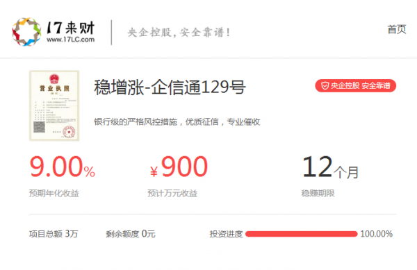 17来财(www.17LC.com)是国政金服旗下以安全稳健、技术创新为特色的网络借贷居间服务中介平台,定位于为中国广泛的互联网用户提供安全便捷的出借服务;17来财充分审视行业发展案例,致力于研发智能投顾体系,以稳健的优质资产端为依托,以国有AA资质大型融资担保机构为保障,不断优化产品设计,为广大投资者提供安全稳健、贴心便捷的网络借贷居间服务。