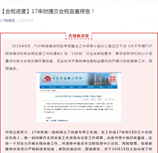 根据监管要求,17来财第一时间成立了自查专项工作组。该工作由17来财CEO王小光担任负责人,第一时间展开全员自查工作进程会议及工作部署,自查专项小组日夜奋战,连续一个月全力开展合规自查工作,对清单中重点关注的信息中介定位、风险管理、信息披露等内容进行严格的逐条检查,做到边查边改,即查即改,并于10月13日之前完成了所有自查工作并形成自查报告。17来财践行合规备案的决心坚定,现已经顺利完成了自查工作,并于2018年10月13日向北京市相关部门提交了合规自查报告!