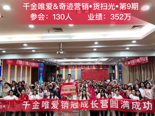 千金唯爱携手奇迹营销货扫光会议,参会人数130人,业绩达到352万元。