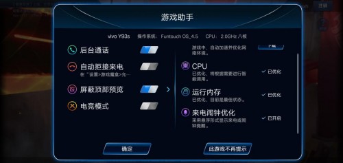 除了在常用功能上全面升级之外vivo为Y93s还配备了专业的游戏模式——游戏魔盒vivo Game Cube,气宗包括游戏助手、电竞模式、游戏空间、熄屏挂机等方面,旨在多维度提升用户体验。