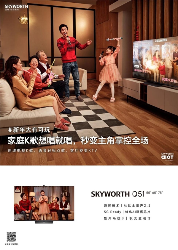 在创维Q51的陪伴下,2021年春节假期,不仅能享受到大屏K歌的乐趣,全家嗨唱,还能在线观看高清视频,享受清晰不卡顿的视觉感受。2021新春,欢唱不停,享受不停!